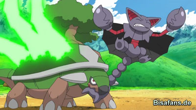 Ash begeht den gleichen Fehler noch einmal und lässt sein Pokémon mit Energieball angreifen. Und auch Kramshef trotzt wie schon Elektek der Attacke mit seinem Schutzschild. Alles wehren nützt nichts, Kramshef lässt sich von Chelcarains Pflanzenattacken nicht beeindrucken und schlägt selber mit starken Attacken zurück. Als letzten Ausweg sieht Ash nur den Solarstrahl, sofern er sich schnell genug aufladen würde. Denn auch diese letzte Rettung missglückt und Kramshef komm abermals den beiden zuvor. So muss auch Ash seinen ersten Verlust beklagen.