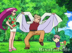 Zeitgleich ist der falsche Professor Eich (James) bei einer offiziellen Veranstalung des Festivals um eine Rede zu halten. Wobei James zuerst Minutenlang starr vor Angst ist. Erst also Jessie und Mauzi ihm einen Plan präsentieren, legt James los und startet mit einer feurigen Rede. Als er um die Pokébälle der anwesenden Gäste bittet, damit diese in die Rede eingebaut werden können, zögert niemand.