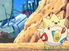 Unsere Freunde versuchen sich unterdessen aus ihrem Gefängnis zu befreien. Glibunkels Attacken helfen hier zuerst nicht, doch als das Togepi vorbeikommt befreit es Ash und die anderen um sie nach einer Aufzugfahrt in eine andere Falle stürzen zu lassen. Dabei grinst es erneut fies.