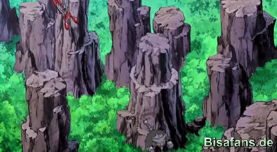 Weiter auf dem Weg nach Sonnewik, zu Ashs 8. Areanaorden, durchqueren unsere Helden einen kleinen, aber dichten Wald. Wie bei ihnen so üblich, verirren sie sich mal wieder. Um ihren Standort festzulegen, holt Ash sein Skorgro aus dem Pokéball und befielt ihm den nächsten Ausweg aus dem Wald zu finden. Skorgro findet sehr schnell den Weg aus dem Wald, weswegen unsere Helden auch schnell den Waldrand erreichen. Sofort erkennen sie eine Schlucht, wo aber auch sehr viele Felsen stehen. Direkt danach können unsere Helden ebenfalls einen verbissenen Kampf zwischen einem Scherox und einem Palimpalim beobachten, den am Schluss das Scherox gewinnt (nachdem Palimpalim gegen Plinfa geschleudert wurde).