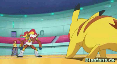 Und wieder treffen sich zwei Attacken in der Mitte. Dieses mal Pikachus Eisenschweif und Panfernos Power-Puch, doch Pikachu verliert den Zweikampf, aber es kann sich noch auf den beiden halten. Der Kampf ist noch nicht vorbei. Panfernos Nahkampf-Kombo von langer Dauer, Panferno setzt Flammenblitz ein, welchen Pikachu nicht ausweichen kann.