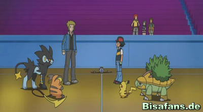 Es ist soweit! Ashs lang ersehnter Arenakampf gegen Volkner beginnt jetzt. Ash beginnt mit seinem Chelcarain, während Volkner sich auf sein Luxtra verlässt. Und dann geht es auch schon los! Ash befiehlt Chelcarain die Attacke Rasierblatt, die Luxtra Ignaz, der auch neben Lucia und Rocko im Publikum sitzt.