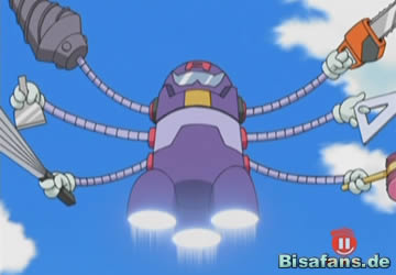 Um das Feuer einzudämmen, setzen Krebscorps, Karnimani und Plinfa Wasser-Attacken ein. Als Team Rocket die vielen Pokémon von Ash sieht, wollen sie natürlich alle schnappen. Ash greift sie mit Lorblatt und Pikachu an, muss aber merken, dass der Roboter diesmal sehr robust ist. Alle Hoffnung von Ash liegt nun in Relaxo, doch dieses will nicht aufwachen. Also kommen Karnimani, Krebscorps und Plinfa mit Wasser-Attacken wieder zum Einsatz um Pikachus folgenden Donnerblitz effektiver zu ohne Erfolg. Team Rockets Roboter ist einfach zu stark.