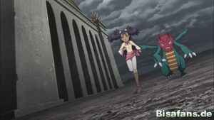 Im Anschluss laufen Mitglieder von Team Plasma aus dem Schloss raus und die stürmen die Stufen runter. Lilia befiehlt Shardrago, eine der Stiegen zu zerstören und sie meint daraufhin, sie könne nicht verstehen, wovon die Weisen eigentlich reden. Diese schicken jedoch ihre Kleoparda auf Lilia los, um sie anzugreifen. In letzter Sekunde wird sie von einem Stalobor gerettet, welches sich aus dem Erdboden katapultiert hat. Es stellt sich heraus, dass dieses Stalobor dem Arenaleiter Turner gehört, der soeben neben Lilia auftaucht.