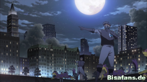 In Twindrake City herrscht Nacht, als einige Explosionen in der Stadt ausbrechen. Feindliche Kleoparda von Team Plasma verwüsten die Stadt mit Hyperstrahl, während einer der Weisen, Violacaeus, dem Geschehen zusieht.