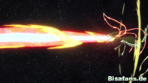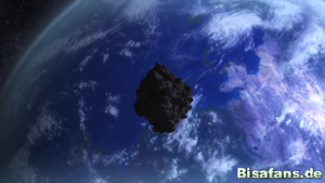 Ein Meteorit fliegt durch das Weltall auf die Erde zu. Mega-Rayquaza greift diesen an und zerstört ihn. Durch die Druckwelle wird die Aufnahme unterbrochen.