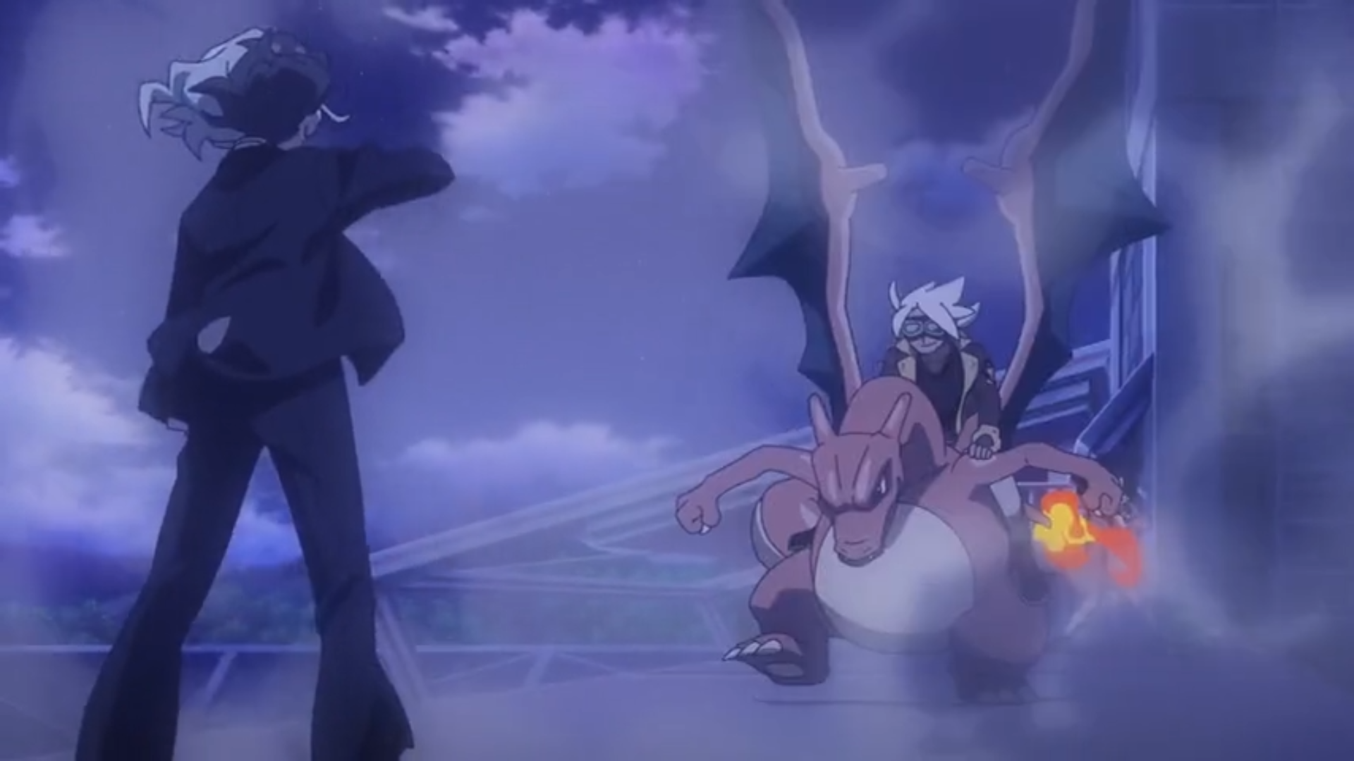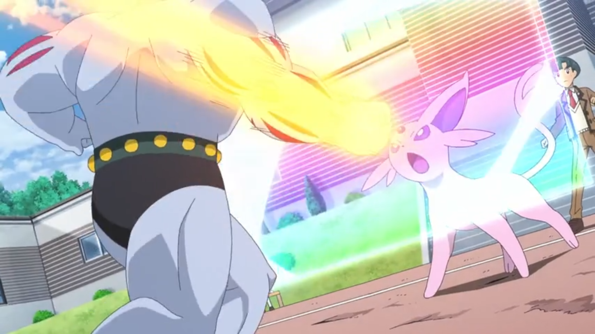 Plötzlich taucht Friedel auf seinem Glurak fliegend auf und erwähnt, dass er ebenfalls etwas von Liko möchte. Amethio ruft sein Azugladis aus dem Pokéball und es entbrennt ein hitziger Kampf zwischen ihm und Glurak. Liko klettert weiter nach oben und gemeinsam mit Felori möchte sie von einem Dachvorsprung zum nächsten springen. Azugladis’ Psychoklinge steuert jedoch auf sie zu und droht, sie zu verletzen. Jedoch geht vom Anhänger ein Licht aus, das die beiden umhüllt.