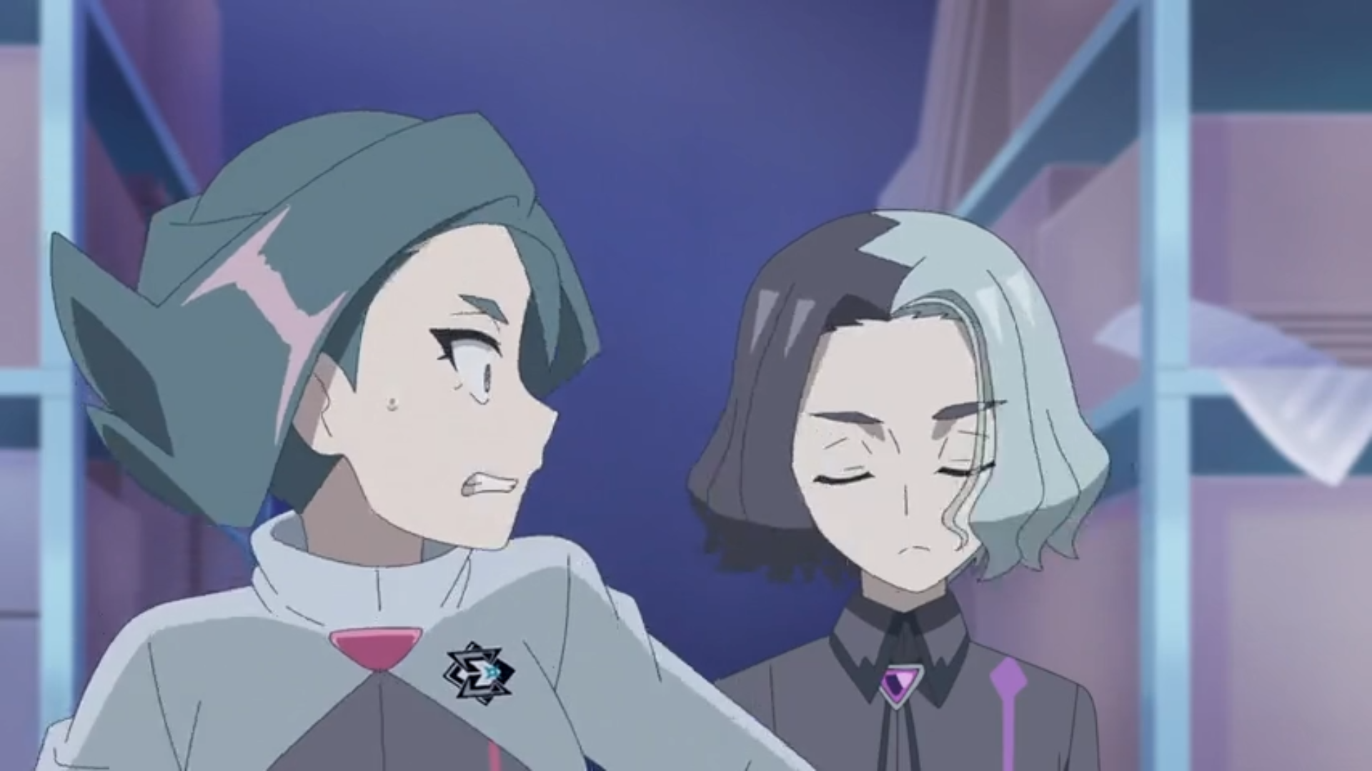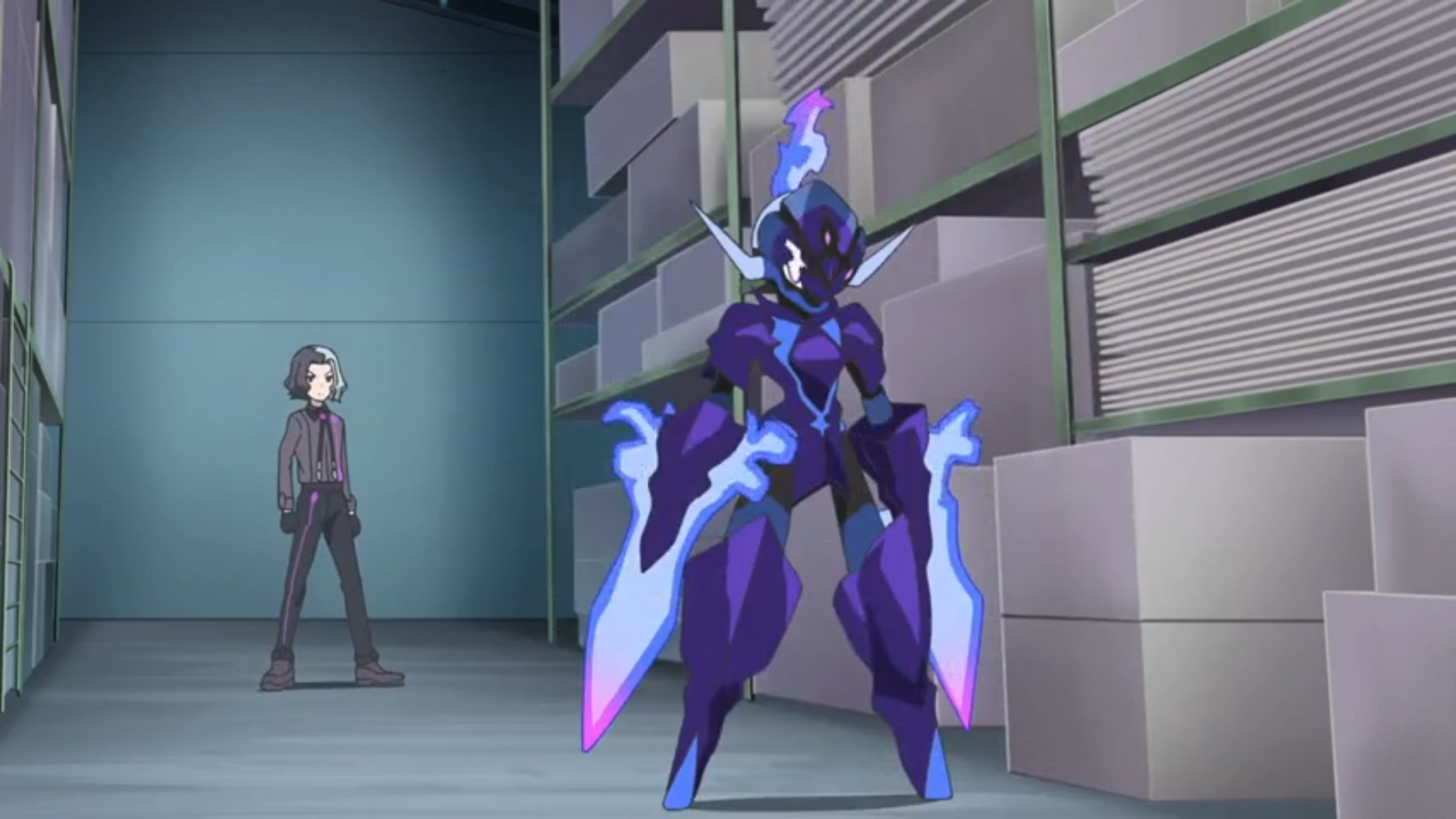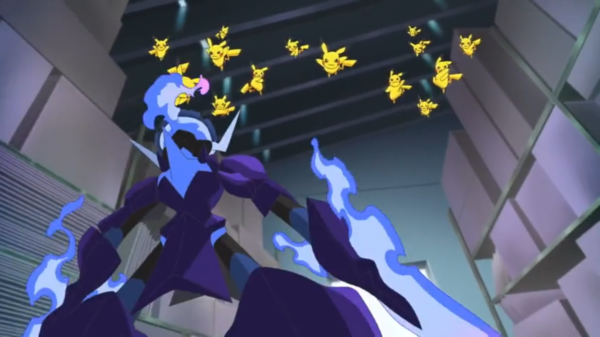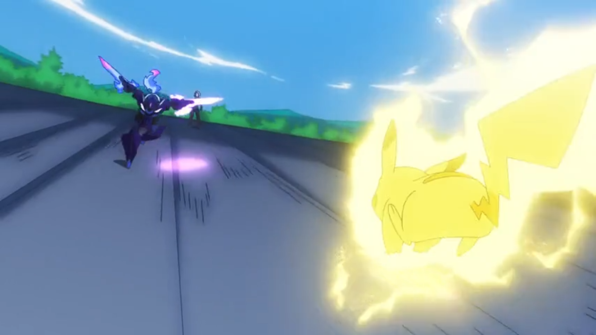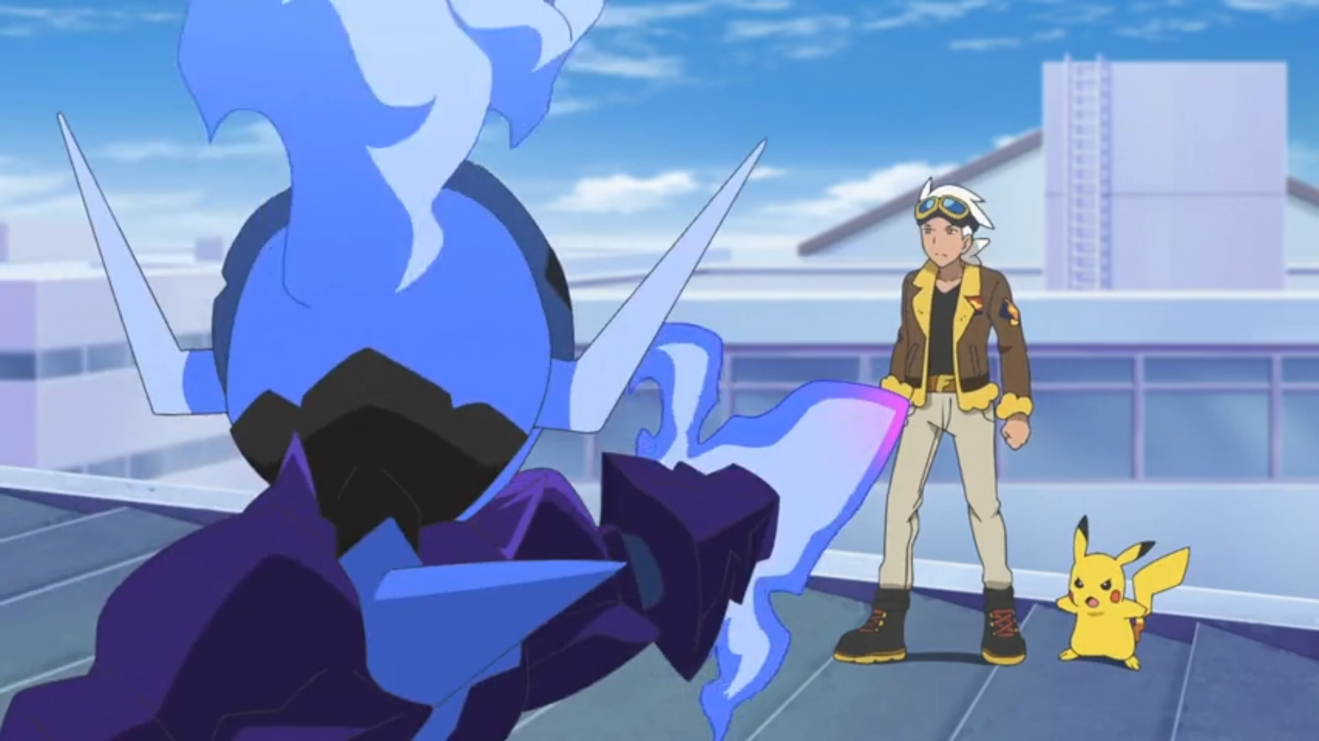 Friedel und Liko stiften vor der Lagerhalle einen gemeinsamen Plan und betreten diese schließlich. Innen erwartet sie Amethio und Friedel schlägt einen Pokémon-Kampf als Deal vor, um Felori zu erhalten. Ihr Gegner willigt ein, sofern er bei einem Sieg Liko und ihren Anhänger erhält. Daraufhin werden Pikachu und Azugladis in den Kampf geschickt. Pikachu versucht, sich mit Doppelteam und Donnerschlag durchzubeißen, wird jedoch von Azugladis’ Psychoklinge und Phantomkraft zurückgedrängt. Der Kampf wird im weiteren Verlauf auf das Dach des Gebäudes verlegt.