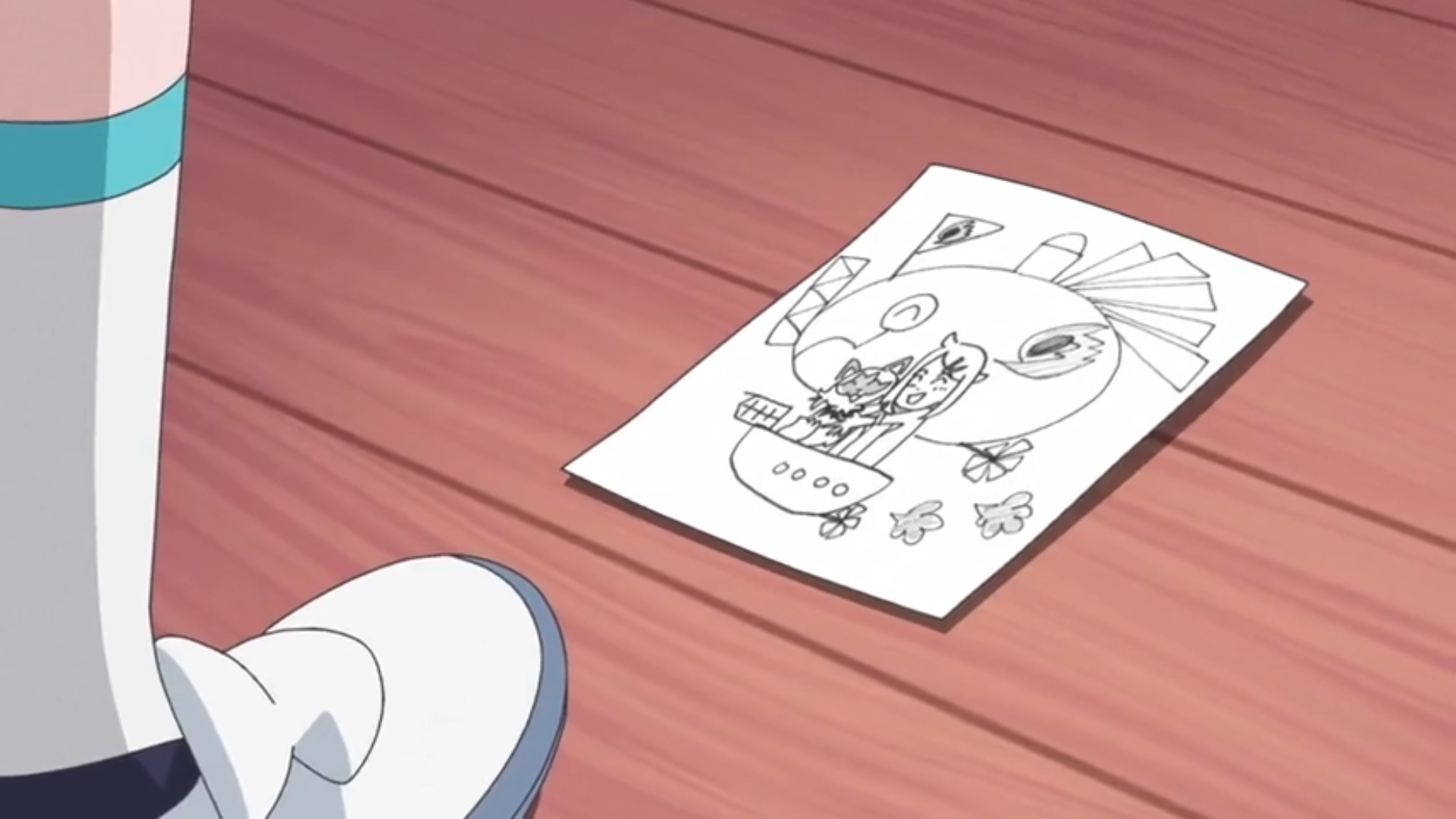 Bevor sie auf Glurak davonfliegen, bemerkt sie schließlich noch das abgeschlossene Bild ihres Vaters, auf dem Hefel und Felori schlafend gezeigt werden.