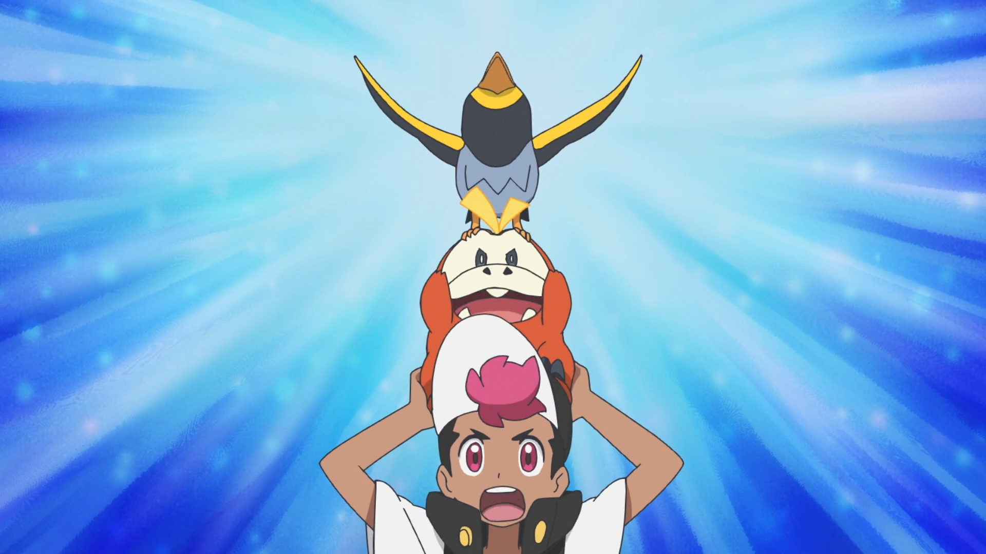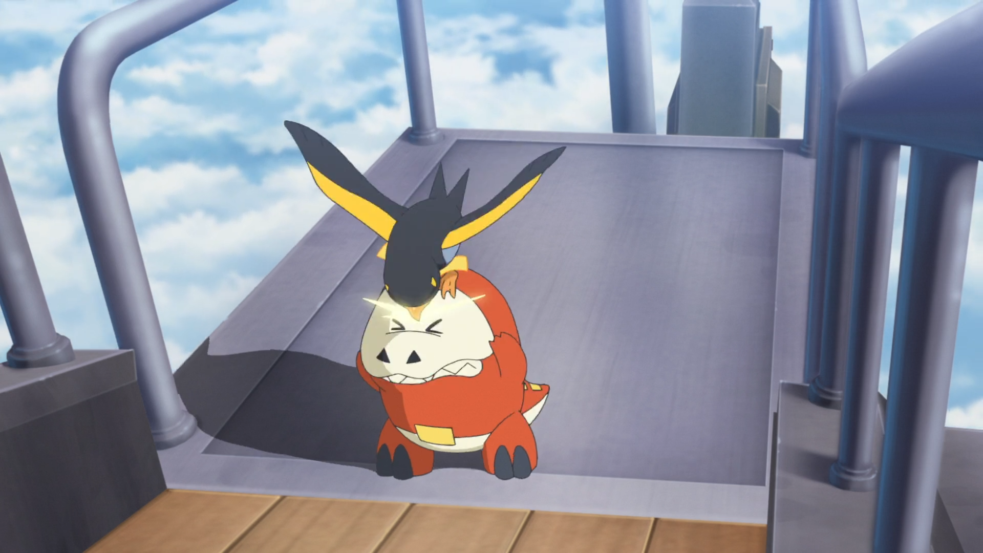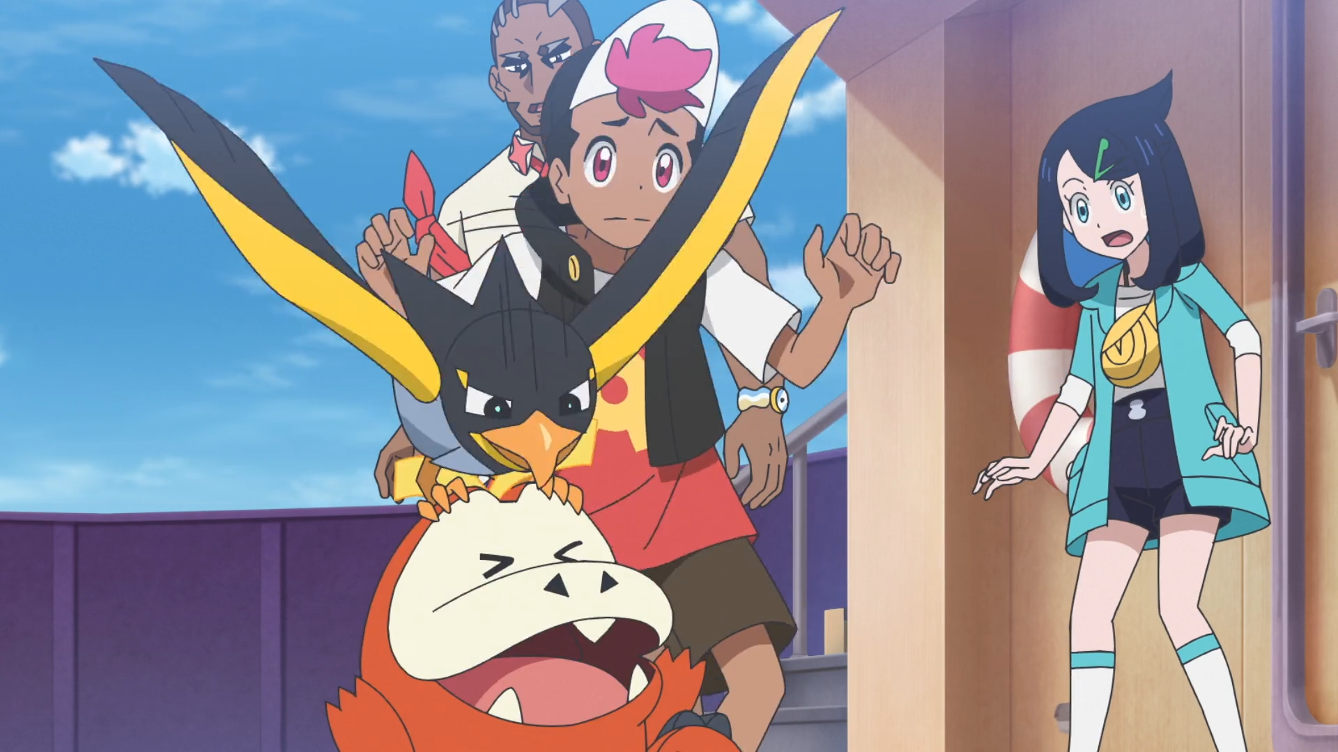 Beim später stattfindenden Essen möchte Voltrel für sich sein, da sein Teampartner erneut das Licht verdeckt. Rory hofft, dass sie sich bald wieder vertragen, jedoch bricht erneut ein Streit zwischen den beiden aus. Auf Krokel pickend laufen Trainer und Pokémon schließlich auf dem Luftschiff umher. Liko ist von dem Verhalten belustigt und wird von Orla gefragt, was sie von einem neuen Pokémon halte. Tatsächlich weiß sie nicht, ob sie mit der Herausforderung zurechtkommen würde.