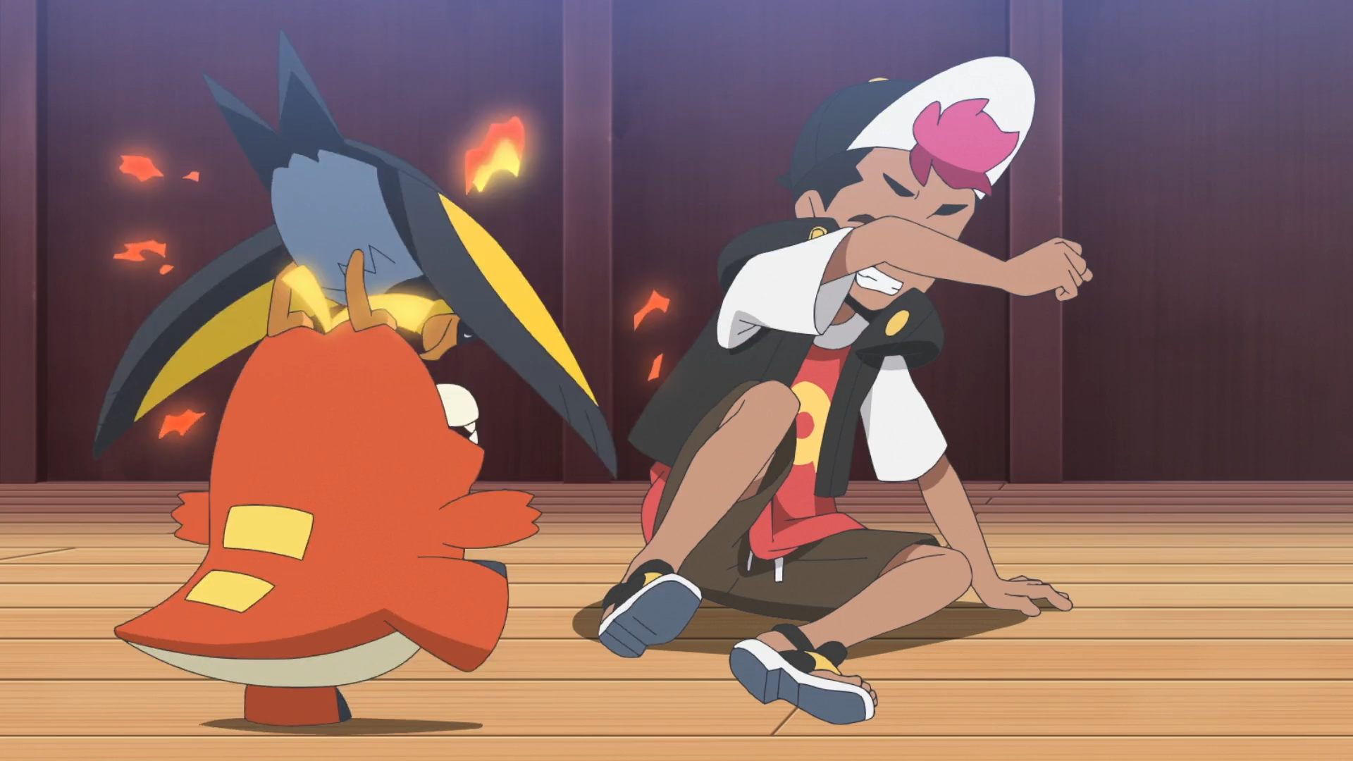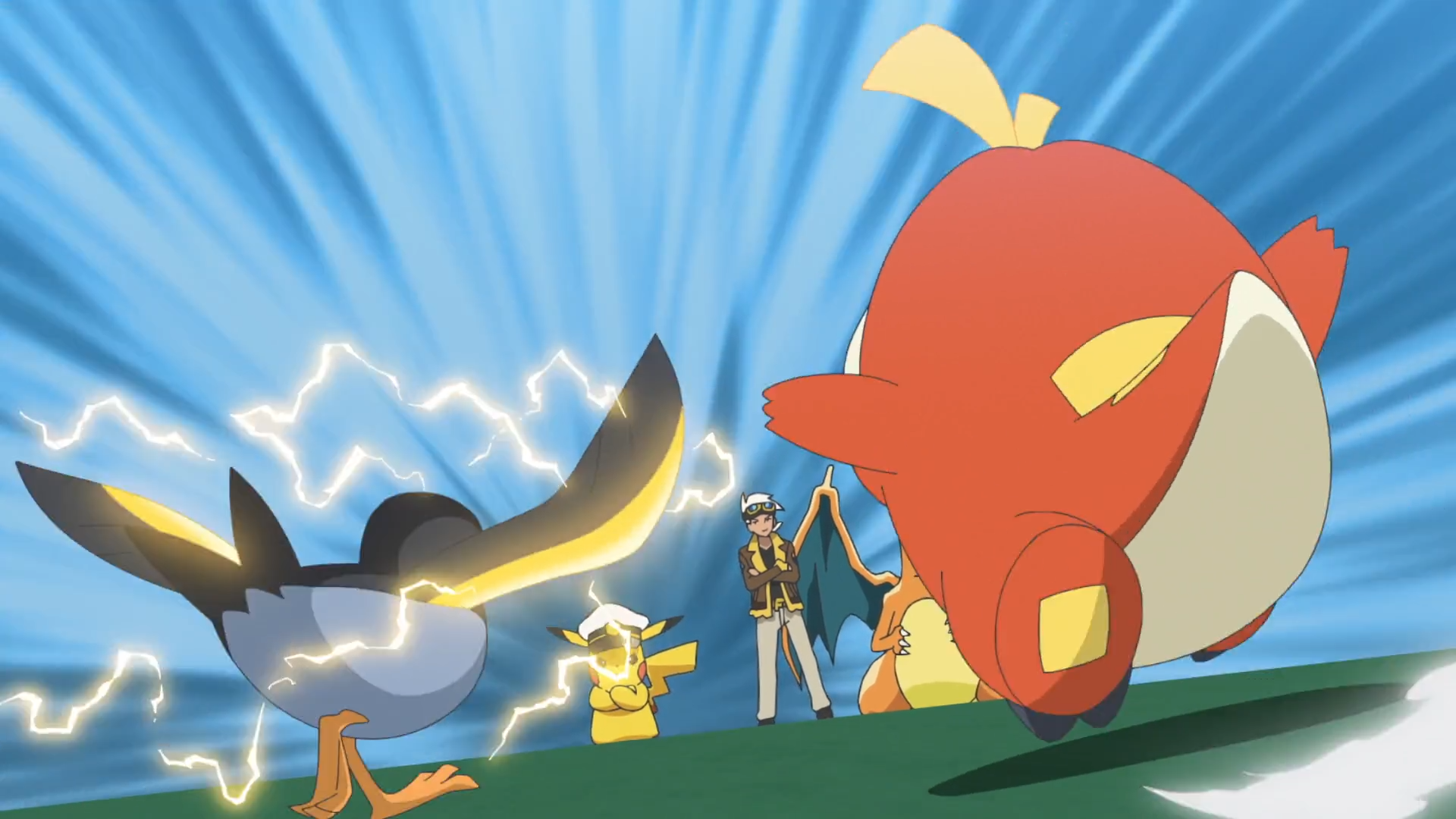 Ein lautes Geräusch lässt sie jedoch alle verstummen und sie bemerken, dass Friedels Glurak und Captain Pikachu ihre Angriffe trainieren. Krokel ist wie immer begeistert von Glurak, allerdings interessiert sich auch Voltrel für die eingesetzten Elektro-Attacken. Friedel erklärt daraufhin, dass seine Pokémon zur Entspannung gemeinsam trainieren und Rory hat eine Idee. Er möchte ein Spezialtraining mit Pikachu starten, damit sich sein Team besser aufeinander abstimmen kann. Ihr Gegner kann der Glut und dem Aufruhr erfolgreich entgehen. Als Voltrel auf Pikachu zuläuft, setzt es durch die ausgebreiteten Flügel Funkensprung ein. Doch auch mit der neu erlernten Attacke können sich Rorys Pokémon nicht behaupten. Sie verlieren die Partie schließlich, als Pikachu die beiden austrickst und sie ihre Attacke gegeneinander einsetzen. Daraufhin brechen sie erneut in einen Streit aus, da sie sich gegenseitig die Schuld für die Niederlage geben.