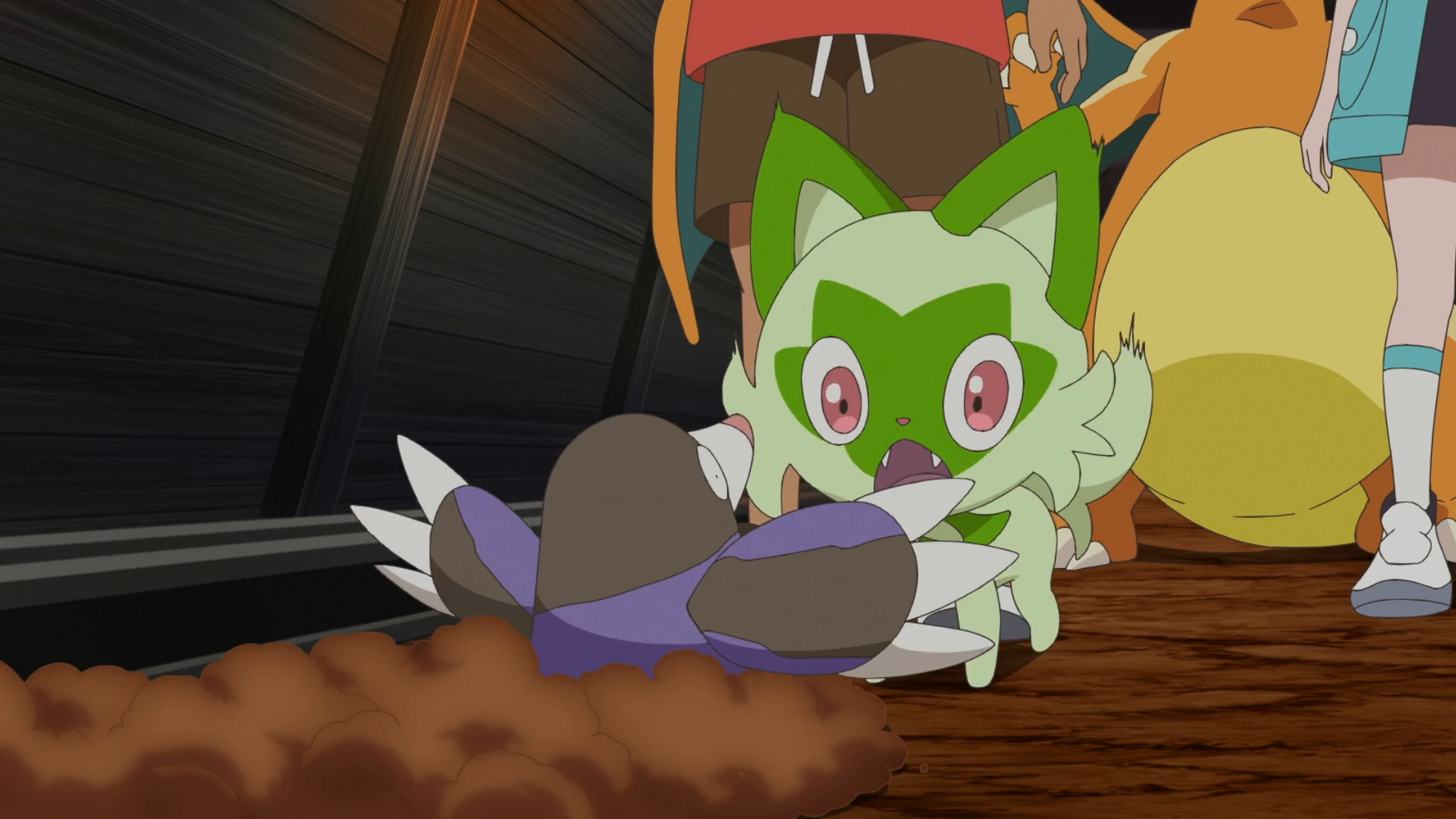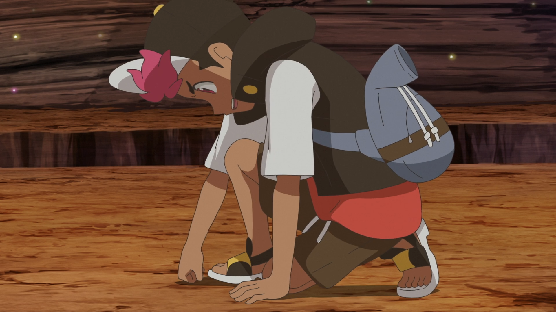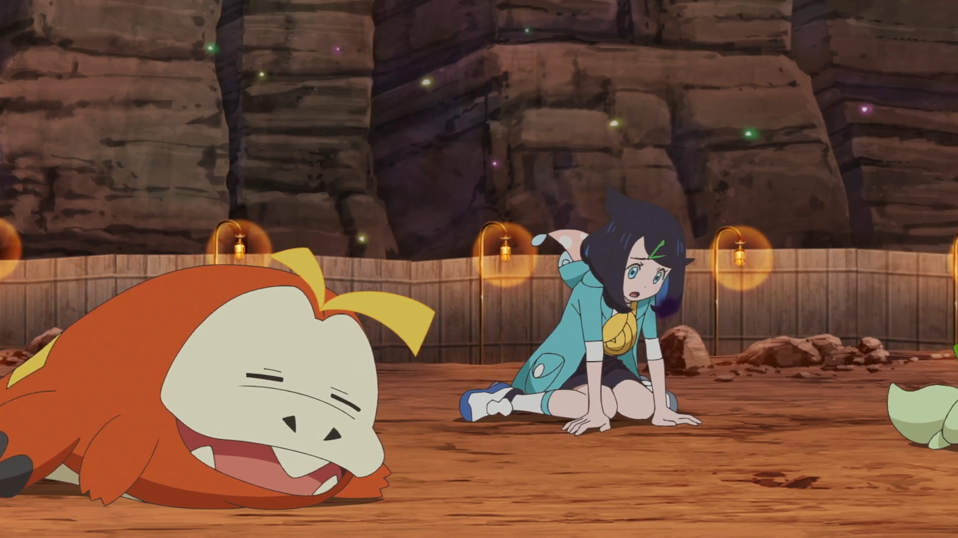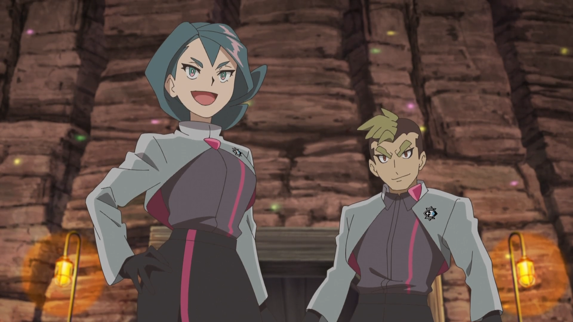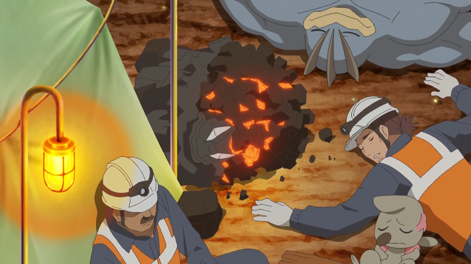 Ein weiterer Schrei ertönt und Fleknoil bringt die Kinder in die Nähe einer großen Felsspalte. In der Nähe befindet sich ein Team aus mehreren Bergbauarbeitern und ihren Pokémon, die sich erschöpft in ihrem Lager befinden. Einer der Männer erzählt davon, dass ein riesiges Pokémon aufgetaucht sei und ihre Ausdauer verschlingt habe. Liko ruft das Pokémon-Center an und die Arbeiter fahren mit der Lore zum Eingang zurück. Kurze Zeit danach werden die Kinder allerdings von Zir und Conia überrascht. Diese rufen ihre Pokémon Entoron sowie Rizeros und starten einen Kampf. Während sich Felori auf eine gegnerische Kratzfurie vorbereitet, wird Entoron jedoch von Captain Pikachu zur Seite gestoßen.