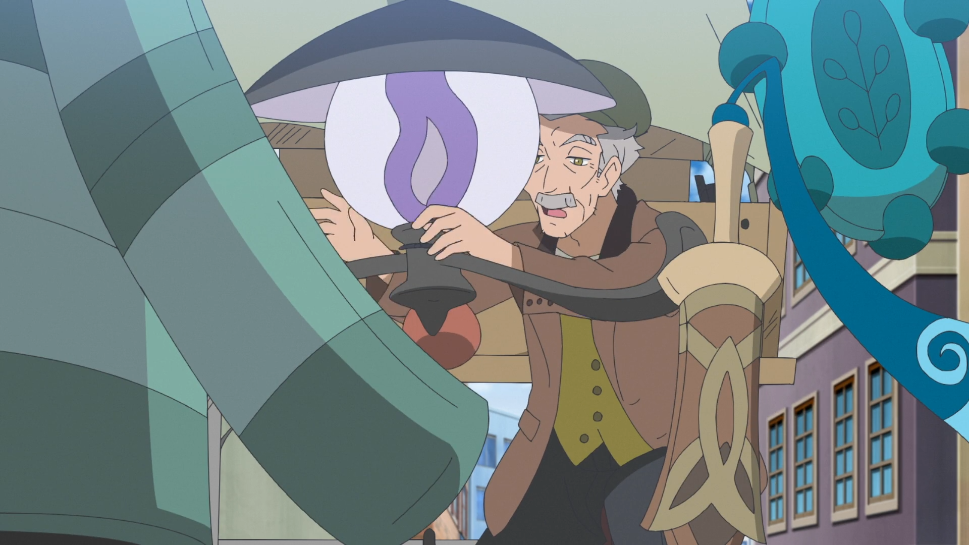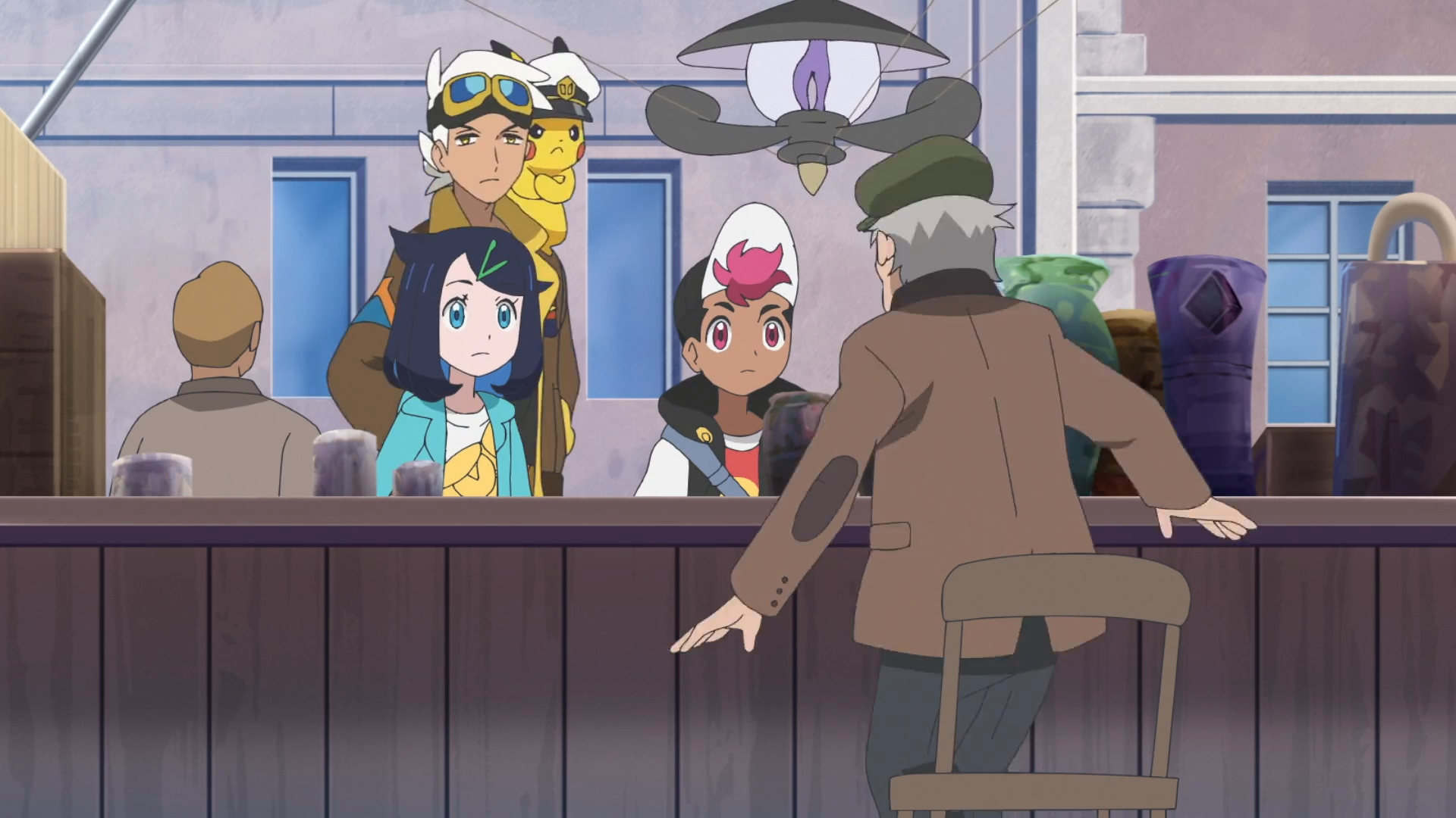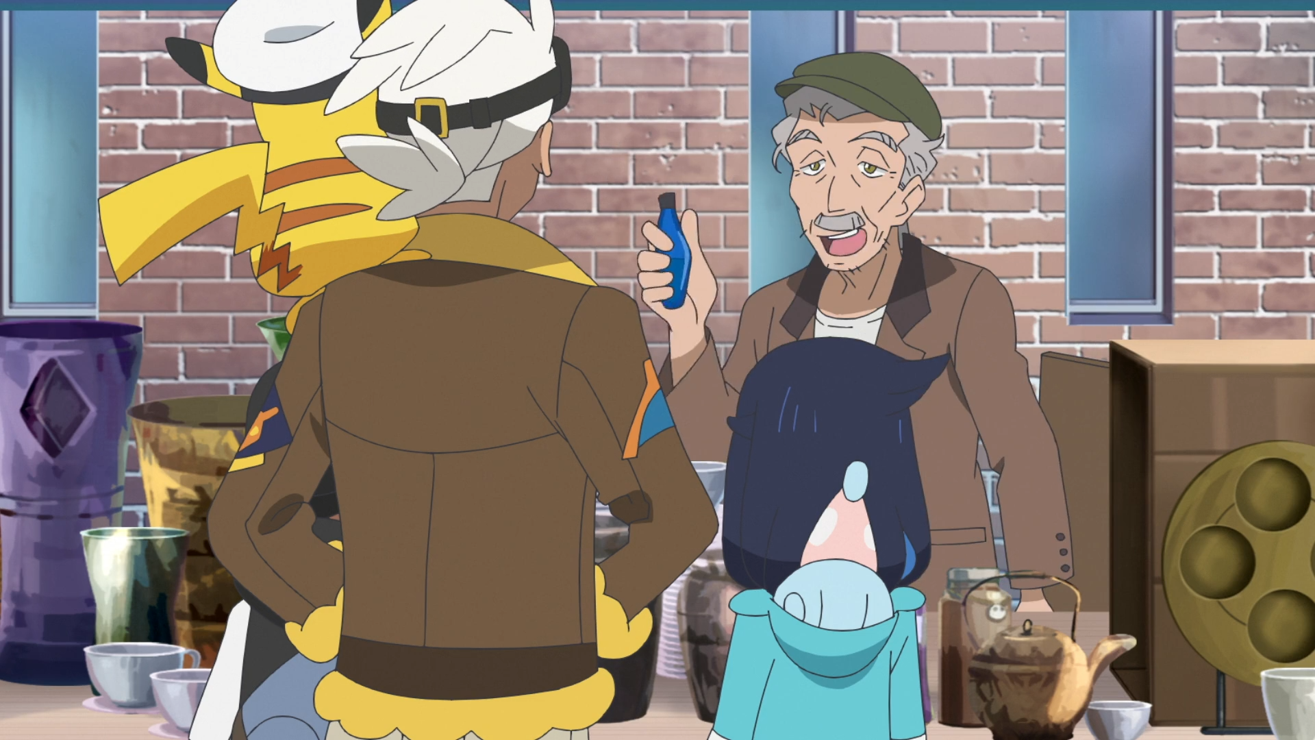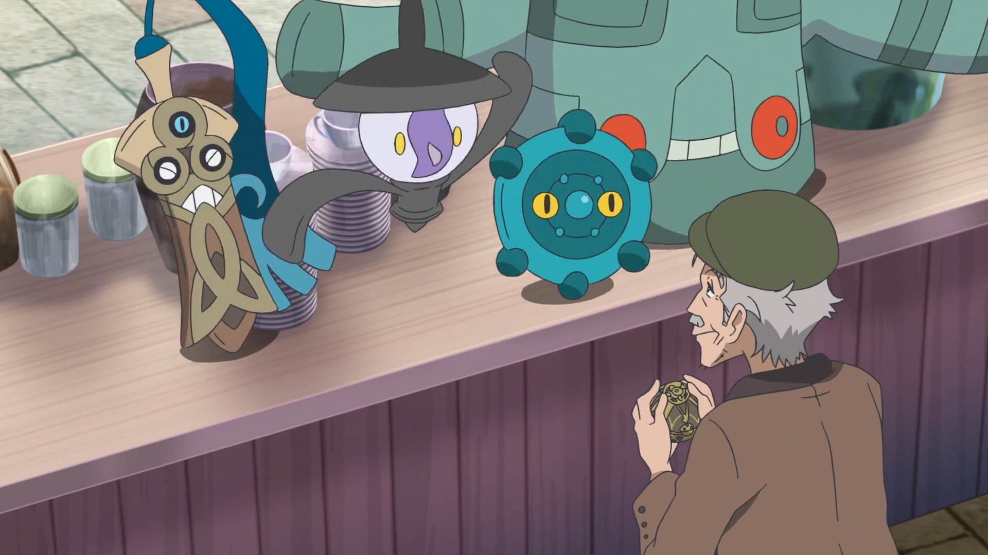 Liko, Rory und Friedel begeben sich zum von Diana vorgeschlagenen Antiquitätenladen auf einem Straßenmarkt. Sie selbst kann nicht mitkommen, da sie Lucius antiken Text des besagten Freundes untersucht. Die Gruppe bemerkt ein Laternecto vor dem Stand und weckt den älteren Mann hinter dem Tresen auf. Er präsentiert gleich seine Waren, worunter sich ein potentes Schlafmittel für Pokémon und ein 20.000 Jahre altes Smart-Rotom befinden. Liko unterbricht ihn jedoch und stellt sich als Dianas Enkelin vor. Der Mann erinnert sich, mit Diana unterwegs gewesen und in einem Ariados-Netz gefangen worden zu sein. Friedel empfindet die Geschichte als seltsam. Rory zeigt ihm schließlich den antiken Pokéball, worauf der Mann beinahe in Panik ausbricht. Er nimmt ihn interessiert entgegen und begutachtet den Ball, kann ihn allerdings nicht wiedererkennen. Daher gibt er Rory seinen Beutel mit dem antiken Pokéball zurück. Nachdem sie gegangen sind, wird Brimova nervös und erkennt in dem älteren Mann bösartige Emotionen. Im gleichen Moment werden jedoch Rory und Krokel hungrig und die anderen führen das darauf zurück, dass Brimova ebenfalls Hunger hat. Nach einiger Zeit beruhigt es sich entnervt.