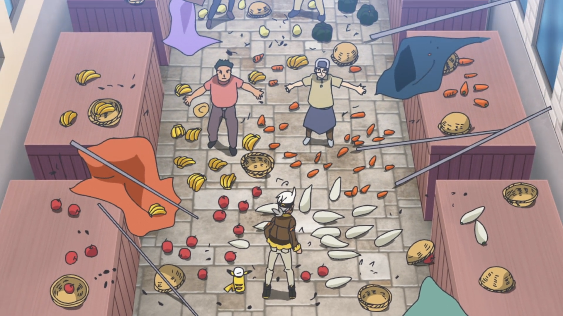 Zur Rede gestellt stellt sich der Mann dumm und lädt den Aeronauten dazu ein, seinen Wagen zu untersuchen. Nachdem Friedel dort nichts findet und fragt, wo Laternecto ist, flüchtet der Dieb durch eine Straße mit mehreren Marktständen. Glurak verfolgt ihn und demoliert dabei sämtliche Stände, die es und Friedel zuerst wieder in Ordnung bringen müssen.