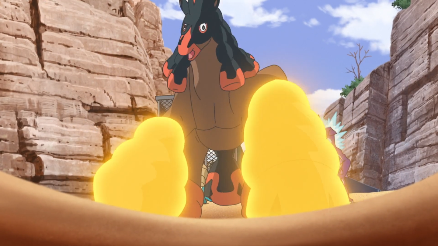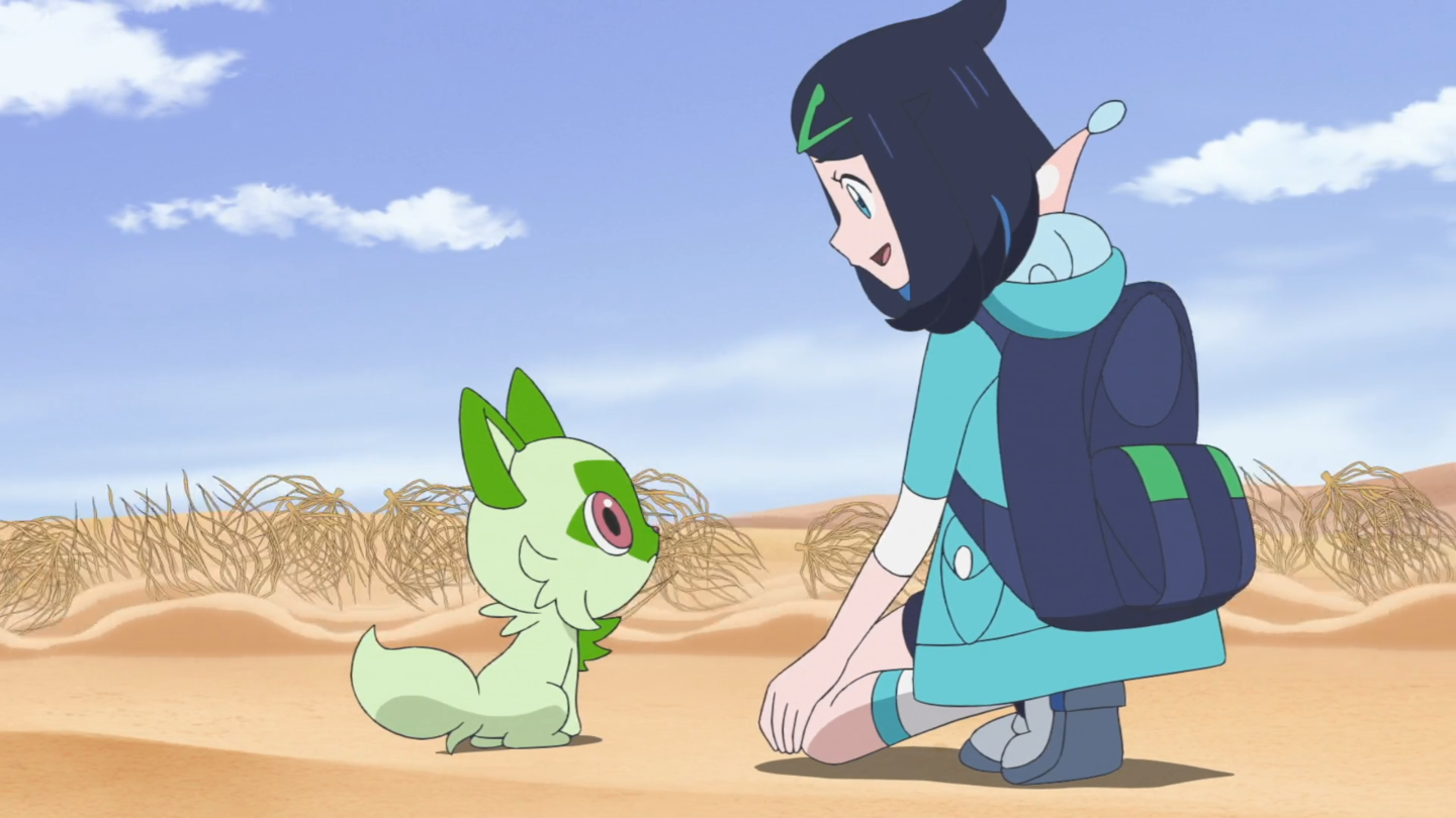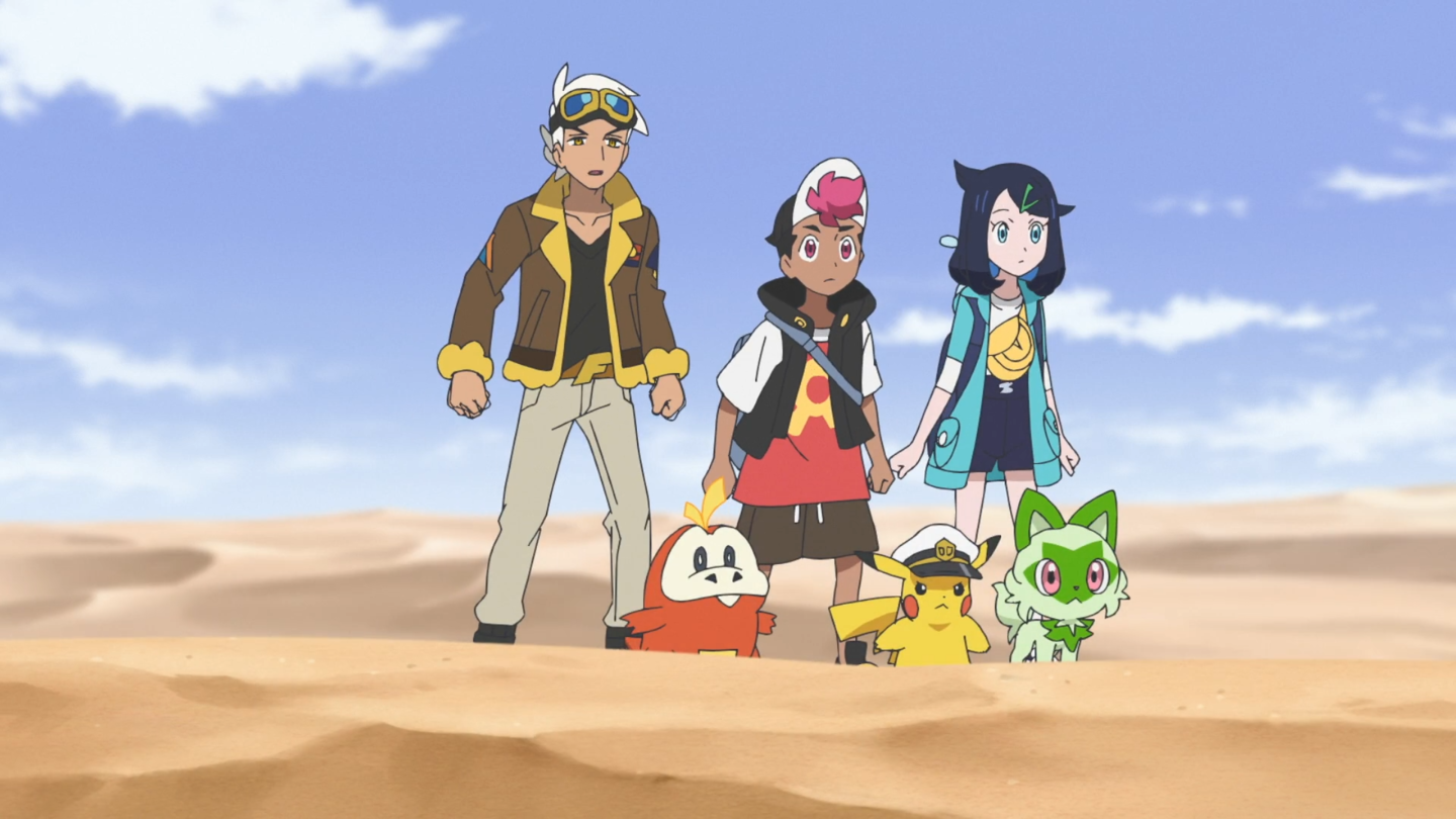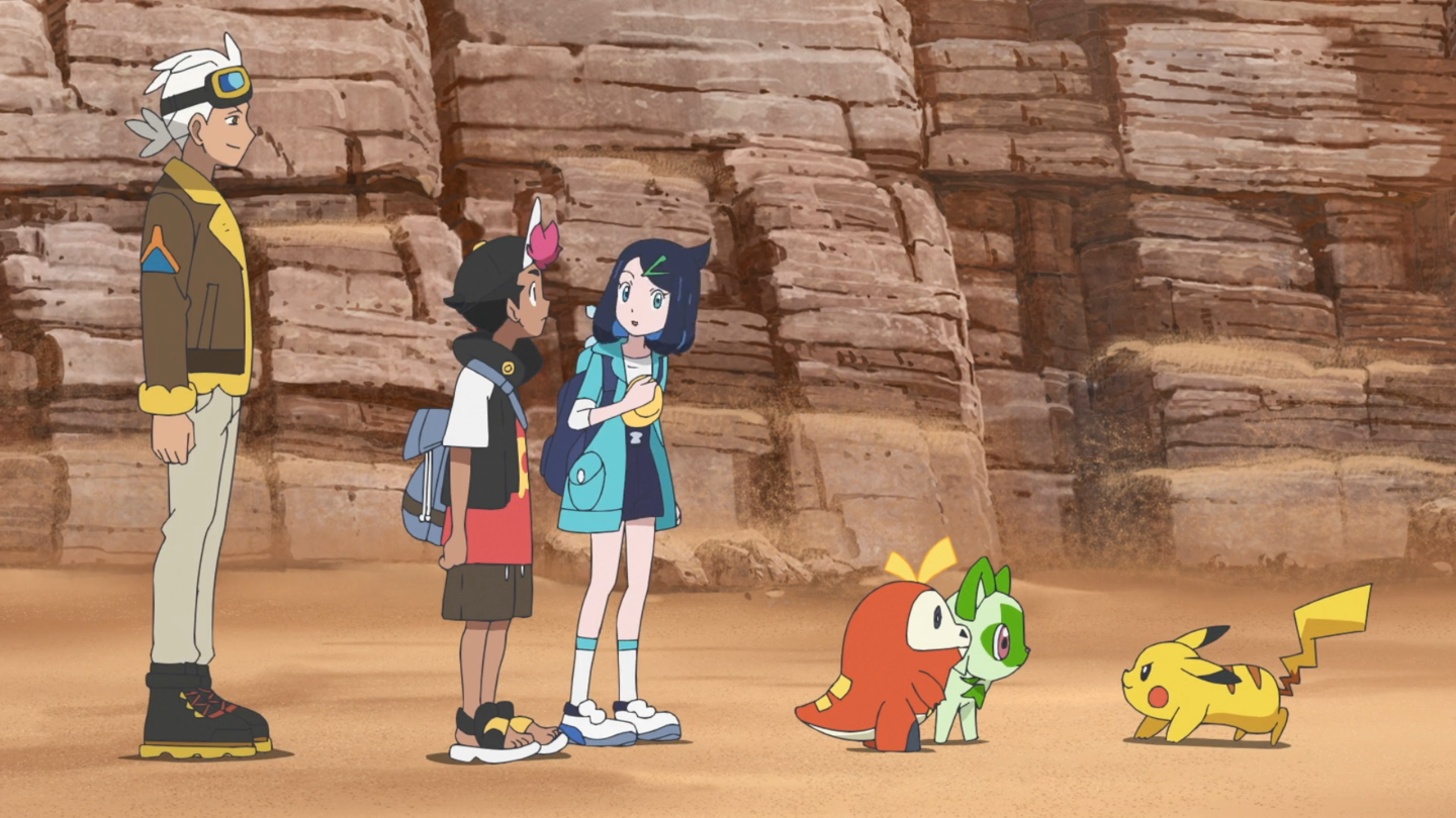 Die Truppe macht sich auf und findet nach einiger Zeit in einem Grasbüschel das gesuchte Weherba. Allerdings wird es vom Wind weggetragen und die Aeronauten kommen kaum hinterher, um es zu fangen. Es fliegt hinter Lucius großen Felsen, wo sich einige Rihorn befinden. Rory stößt in eines hinein und die Herde verfolgt die Gruppe, bis sie sich auf eine Erhöhung retten können. Dort befindet sich ein Wegweiser, der in einer Richtung eine Wüste und in der anderen eine Oase anzeigt. Da Weherba kein Wasser mag, möchte Friedel zur Wüste gehen. Captain Pikachu möchte allerdings in Richtung der Oase. Liko wird während ihres Streits darauf aufmerksam, dass Pikachu auf einem Baum weiter oben hängt. Es dauert nicht lange, bis Weherba wieder vom Wind davongetragen wird und in der Wüste landet. Die Aeronauten finden dort eine große Menge von Steppenläufern, unter denen sich tatsächlich Weherba befindet. Als Liko abrupt aufsteht, fällt Terapagos aus ihrem Rucksack. Sie bemerkt daher nicht, in welche Richtung das Pokémon unterwegs ist.