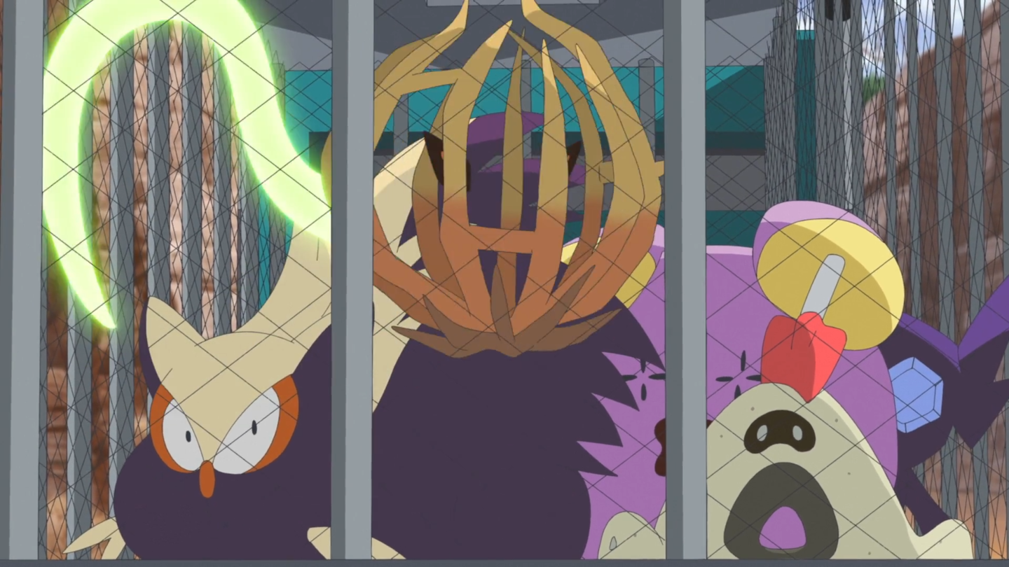 Schließlich machen sich die drei zur Oase in der Nähe auf, wo sie tatsächlich einige Diebe beim Verstauen von Pokémon beobachten. Sie können die zwei überwältigen und erfahren, wo sich Weherba befindet. An der besagten Stelle angekommen sind die Diebe nicht begeistert, dass sie aufgespürt wurden. Die Männer rufen ihre Pokémon Riffex, Amoroso und Pampross, die von Pikachus Donnerschlag zurückgedrängt werden. Die Frau bei ihnen findet Pikachu niedlich und möchte es gern haben. Daraufhin setzt wieder seine Allergie ein und die gegnerischen Pokémon können problemlos zurückschlagen. Da treten Felori und Krokel auf und schaffen es, Riffex und Amoroso aufzuhalten. Pampross setzt die Pokémon weiter unter Druck und Weherba beginnt, mittels Blattgeißel den Käfig zu zerstören.