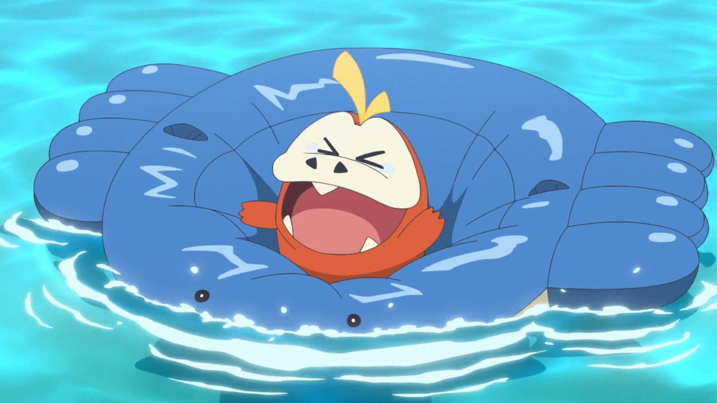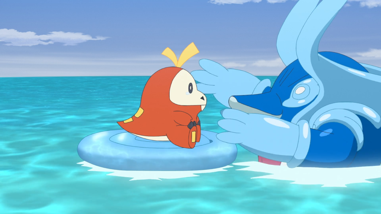 Krokel schläft währenddessen auf einer Luftmatratze und wird von einer Welle aufs Meer hinausgezogen. Es bricht dabei in Panik aus und stampft ein Loch in die Matratze. Bevor Rory zu ihm hinschwimmen kann, taucht jedoch wieder Delfinator auf und rettet Krokel. Im Anschluss vollbringt das Pokémon noch einige weitere alltägliche Aufgaben und Heldentaten, bei denen seine Fähigkeiten genauer erklärt werden und taucht erneut im Meer ab.
