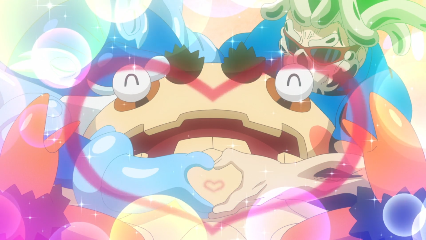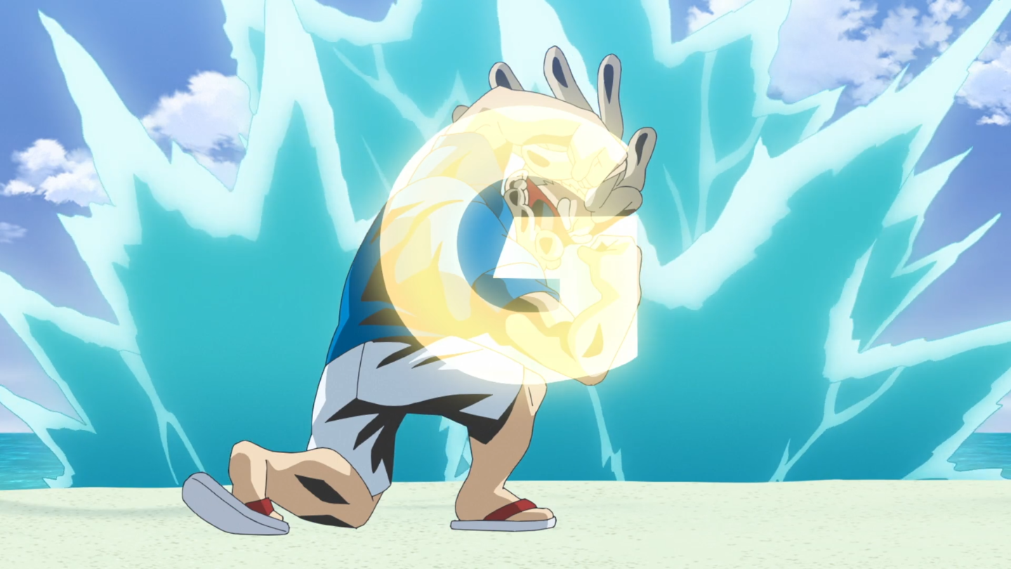 Ludlow beschließt am nahegelegenen Strand, Lucius eigenen Formwechsel durchzuführen und wird zu Mighty G, dem Helden der Weltmeere. Er ruft sein Tohaido, das ihn in Windeseile zum Ort des Geschehens bringt. Tohaido drängt die Klibbe zurück und Mighty G feiert sein Wiedersehen mit Delfinator. Anschließend gibt er den Anwesenden zu verstehen, dass sie das Pokémon anfeuern sollen. Gemeinsam umarmen die beiden schließlich sämtliche Klibbe und beruhigen sie auf diese Weise. Zuletzt verschwinden beide im Wasser.