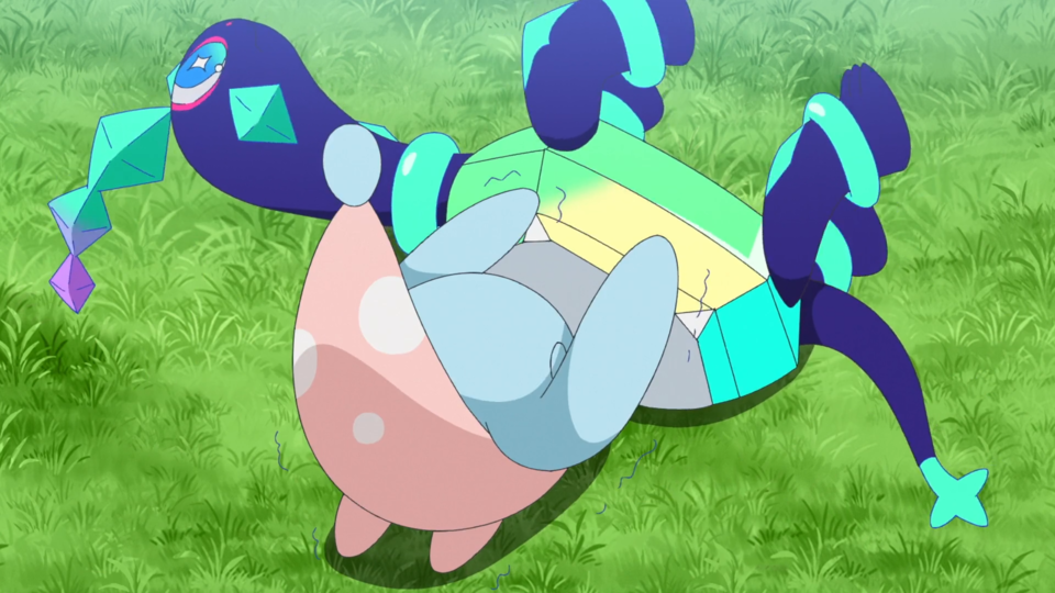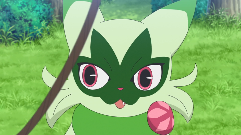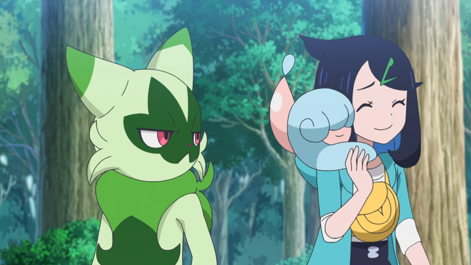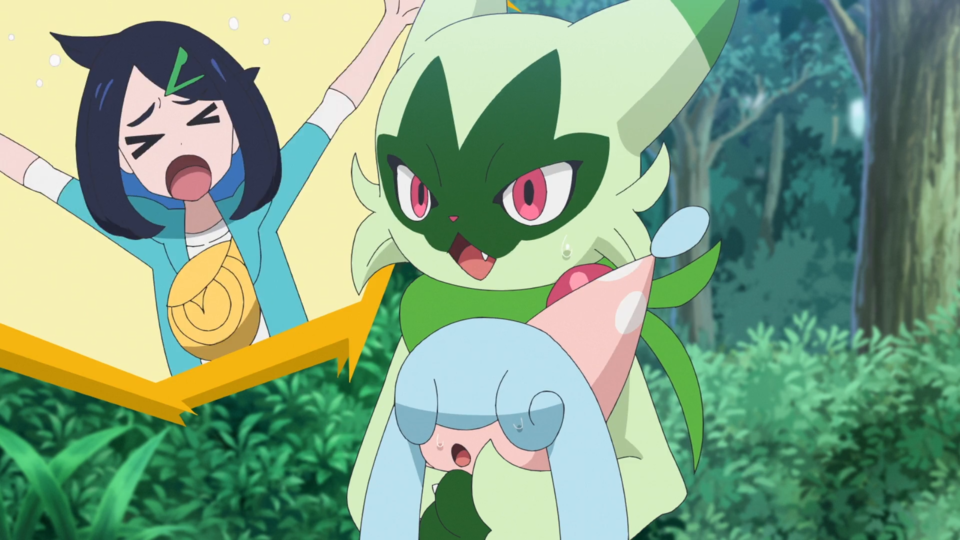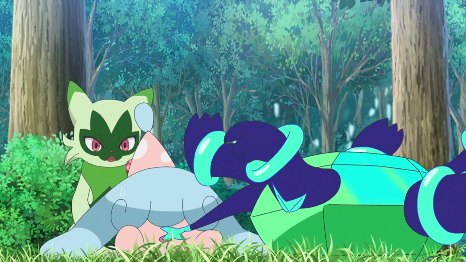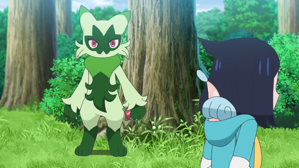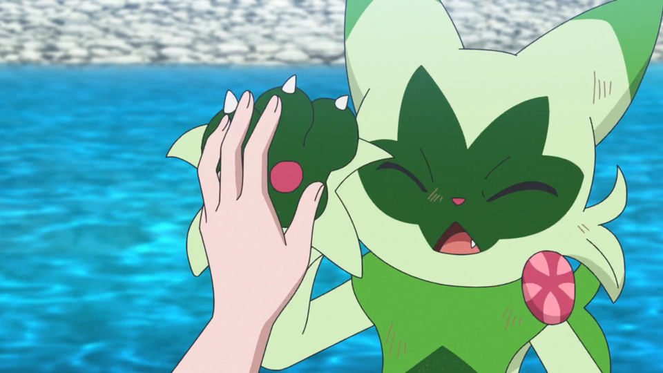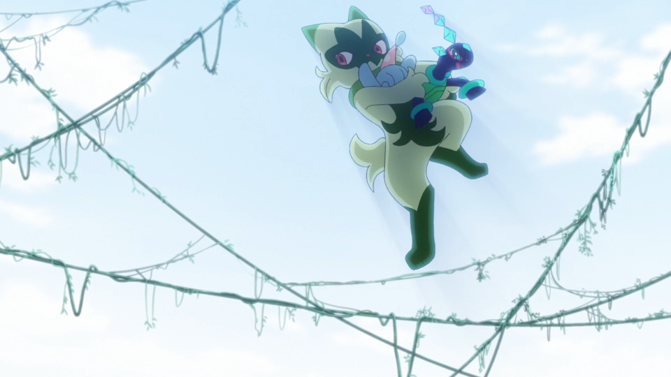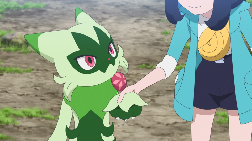 Beim nahen Fluss werden die Spuren des Angriffs von den Pokémon abgewaschen. Als Brimova wieder sauber ist, fliegt ein wildes Voltrean über das Gewässer. Rory und auch Voltrel sind so begeistert von ihm, dass sie von diesem Pokémon einen Bericht schreiben wollen. Dot kehrt zu den Zelten zurück und Liko lässt Terapagos frei. Gerade, als sie sich um Feliospa kümmern möchte, wird Brimova wieder dreckig und anschließend sauber gemacht. Mit seinem Jojo schnippt Feliospa geschickt einen Kieselstein weg. Es möchte Liko diesen Trick zeigen, die allerdings nur Augen für Terapagos hat, das sich wieder aus dem Staub machen möchte. Nun deutlich schlechter gelaunt wendet sich Feliospa von seiner Trainerin ab. Sie möchte es am Kopf berühren und bemerkt, dass sich das Fell des Pokémon wie Dornen aufgestellt hat. Feliospa schlägt eine weitere Berührung aus und läuft anschließend davon.