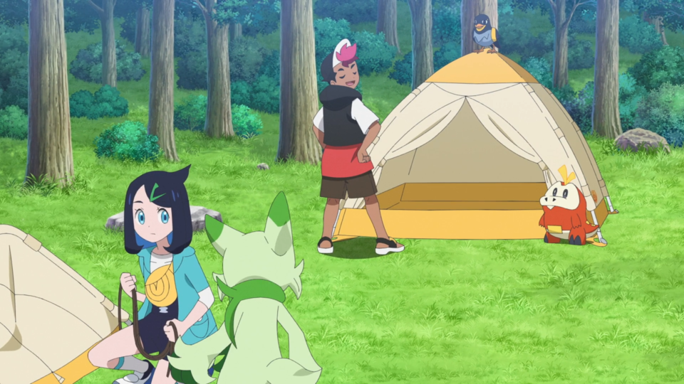 Die erste Herausforderung ist das Aufstellen der Zelte. Liko ist das im Gegensatz zu Rory nicht gewöhnt und sie lässt ein loses Seil baumeln. Feliospa ist davon so fasziniert, dass es das Mädchen umstößt und sie von der Zeltplane begraben werden. Nachdem beide darüber lachen, begutachten sie Dots Campingplatz. Vor dem Eingang ihres Zelts befindet sich ein großer Stein, den sie als Arbeitsstation nutzt. Bevor sie weiter darauf eingehen können, holt Feliospa Liko zu sich und zeigt ihr ein Tannza, das von einem Baum hängt. Während sie seinen Dexeintrag prüft, stolpert Rory über eine Wurzel und knallt gegen den Baum. Tannza ist so überraschen, dass es sich fallen lässt und explodiert.