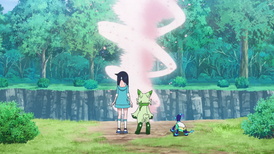 Beim Campingplatz begutachtet Dot die Forschungsaufzeichnungen und bemerkt, dass Feliospa allein etwas abseits steht. Sie fragt Liko, ob etwas vorgefallen ist und erhält als Erwiderung, dass es nur eine schlechte Laune sei. Dot erzählt von dem mysteriösen Phänomen einer Blumensäule, die sich hier in der Gegend auftun soll. Dabei werden eine Menge Blütenblätter durch einen Sturm in die Höhe gewirbelt. Was es auslöst und wann das passiert, ist bisher aber nicht bekannt. Zusätzlich existiert ein Gerücht, dass der Anblick dieser Blumensäule Glücklichkeit bringen soll. Somit beschließt Liko, gemeinsam mit Feliospa nach diesem Phänomen zu suchen. Noch während sie es davon überzeugen möchte, mit ihr zu kommen, bemerkt Liko Terapagos’ Abwesenheit. Somit lenkt sie den Fokus, sehr zu Feliospas Leidwesen, auf die Suche des Pokémon. Während beide im Gebüsch verschwinden, wird Dot hingegen selbst aufgehalten. Kwaks möchte seiner Haarpflege nachgehen und Forgita kann erfolgreich davon abgehalten werden, eine Pfanne zu einem Hammer zu verarbeiten.