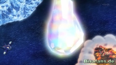Dann aber wird Mega-Glurak X voll von einem Angriff Proto-Groudons getroffen und auf das Eis geschleudert, wo ein Brocken zerbricht und das Pokémon unter sich begräbt.