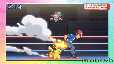 Ash und Pikachu sind in einem Boxring und beide heiß auf einen guten Kampf. Hoopa kommt vorbei und merkt dies, weshalb es einen seiner Ringe wirft und so ein Lohgock, das direkt mit Flammenwurf angreift, ruft. Dabei wird der Boden hinter Ash und Pikachu in Flammen gesetzt und Ash ist nun so heiß auf einen Kampf, dass in seinen Augen Flammen auftauchen.