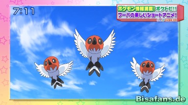 So wird Ash nun vom Windstoß erfasst und in der Luft herumgewirbelt. Währenddessen aber wirft Hoopa nun seinen anderen Ring und lässt viele weitere Vogel-Pokémon erscheinen, die ebenfalls Windböen erzeugen, die Ash das Leben schwer machen.