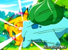 Bevor Ash gehen will, bittet Melanie ihn darum, das Bisasam mitzunehmen, da es sich hier im Wald nicht weiterentwickeln kann und nicht wachsen kann. Das Bisasam selbst stellt jedoch eine Bedingung: Es will in einem Kampf besiegt werden! Das läßt Ash sich nicht zweimal sagen und setzt sein Pikachu gegen Bisasam ein. Der Kampf dauert nicht lange, ist aber sehr erbittert. Zu Beginn kann Pikachu nichts gegen den mächtigen Rankenhieb von Bisasam machen, doch nach einem gewaltigen Donnerblitz ist Bisasam k.o. und wird von Ash gefangen. Ash hat damit ein neues Pokémon!