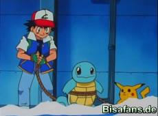 Ash, Rocko und Misty sind inzwischen an der Oberfläche und haben sich auf einer treibenden Holzplatte gerettet. Da sie kein Land in der Nähe sehen, schicken sie – einem Tipp von Rocko befolgend - Tauboga los um die Gegend zu erkunden. Tja, anstatt eine gute Nachricht mitzubringen, findet Tauboga Jessie, James und Mauzi, wie sie vom Karpador gezogen werden. So kommt es also wieder, daß alle 5 wieder beisammen sind…