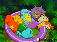 Unterdessen wacht auch Pikachu am Strand auf und befreit Bisasam,