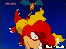 dem Rücken wieder auf! Glurak fliegt hoch in die Lüfte und Ash
