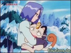 Derweil ist auch Team Rocket auf dem Berg und James und Mauzi frieren sich fast zu Tode. Nur Jessie hat ihren Spass am Schnee. Da fängt Jessie an von ihrer Kindheit zu erzählen. Ihre Mutter habe immer die köstlichsten Sachen mit Schnee gemacht, also eine Schneeschlemmerplatte. Auch wenn Mauzi und James das schon ziemlich kurios finden, wollen sich mit ihrem Ballon auf den Weg machen. Doch als sie ihren Spruch aufführen, treibt der Ballon ab und Team Rocket muss hinterher rennen.