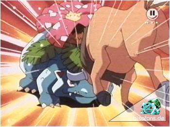 Drake setzt ein mächtiges Bisaflor ein. Ash hält mit seinem neuen Tauros dagegen. Die Geofissur-Attacke des Tauros bleibt im Sand stecken und verpufft. Unterdessen startet das Bisaflor seine stärkste Attacke: Einen Solarstrahl. Ash weiß, daß sein Tauros diese Attacke niemals überstehen könnte und schickt es dem Bisaflor entgegen um es per Bodycheck zu überwältigen. Doch Bisaflor kann lange gegenhalten. Dann wird Bisaflor jedoch mit den Hörnern von Tauros aufgespießt und hoch in die Luft geschleudert. Dadurch kann Bisaflor den Solarstrahl nicht genau zielen und verfehlt Tauros. Nach einem finalen Angriff ist Bisaflor geschlagen. Wieder ein Sieg für Ash!