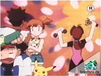 Als Ash ihr dann voller Stolz seinen Orange-Liga Pokal zeigt, mißbraucht seine Mutter diesen zum Hantel-Training – fiese Sache. Kurz darauf stellt sie ihn jedoch auf den Ferseher und staubt ihn liebevoll ab.