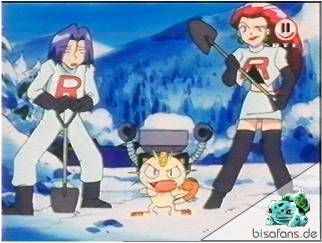 Doch Team Rocket hat gegen Endivie keine Chance, welches für Ash alle anfliegenden Schneebälle von Mauzis Schneeball-Maschine mit einem Rasierblatt zerlegt. Endivies Rankenhieb und Pikachus Donnerblitz besiegen dann endgültig Team Rocket.