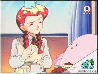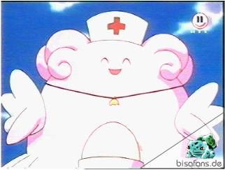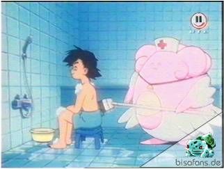 Ash trifft in Glücksstadt ein. Da unsere Freunde ziemlich hungrig sind, suchen sie das erste Pokémon Center auf. Die hiesige Schwester Joy schläft jedoch, so dass sie zuerst von Heiteira verpflegt werden. Das Heitera erweist sich als ziemlich ungeschickt, so dass das ganze leckere Essen auf Ash fällt Bei der darauffolgenden Rückenmassage verwendet Heiteira einen Besen und die daraus folgenden Kratzer auf dem Rücken von Ash werden mit Alkohol behandelt. Klar, dass Ash dabei ganz schön leiden muss.