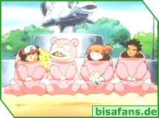 Erst als ein unbekannter Mann ihnen Flegmonkostüme anbietet, können sie der Meute entkommen. Von ihm erfahren sie auch, warum die Leute hier die Flegmon wie Gold behandeln. Dies basiert auf einer Geschichte, wonach ein Flegmon durch sein Gähnen eine Dürre beendete. Als Misty den verkleideten nach dem Grund der Verkleidung fragt fällt ihm ein, daß er noch viel zu tun hat und verschwindet...