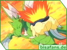 Kai setzt weiterhin auf Zornklinge, doch Feurigel kann geschickt ausweichen. Dabei geht endlich Feurigels Flamme an und es kann einen Flammenwurf auf Sichlor starten. Sichlors Doppelteam hilft hier wenig, doch sein Schwerttanz kann überraschend den Flammenwurf komplett abwehren! Daraufhin kann Sichlor einen Treffer bei Feurigel landen, doch Feurigel ist immer noch kampffähig! Ash muß sich nun etwas neues ausdenken und hat einen neuen Plan. Feurigel springt über Sichlor, der wieder einen Schwerttanz macht und setzt den Flammenwurf diesmal von oben aus an, wo Sichlors Schutz eine Lücke aufweist – Volltreffer! Ein Tackle und Sichlor fällt Kampfunfähig zu Boden. Ash ist Sieger in der Azalea City Arena!