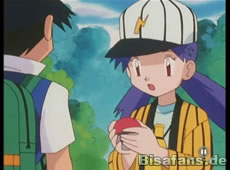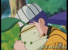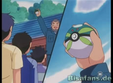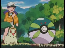 Doch da tauchen Cathy, Misty und Rocko auf. Endivie startet einen Angriff auf Team Rockets Ballon, der jedoch ins Leere geht. Aber dann entwickelt es sich zu Lorblatt weiter und kann nun Lockduft einsetzen, bevor er mit einem Rasierblatt Ash befreien kann! Abschließend folgt natürlich noch Pikachus Donnerblitz, bevor Team Rocket mal wieder das Weite sucht.