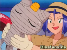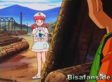 An dieser Stelle lernen wir auch den Künstler Gangoh kennen, der extra alle 12 Jahre hierherkommt um das mysteriöse Regenbogenlicht zu zeichnen, nachdem er die letzten Jahre nie genug Farben dabei hatte. Als unsere Freunde erwähnen, daß sie das Licht auch gesehen hatten, zeichnet Schwester Joy auf einer Karte die beiden Positionen ein, von denen man das Licht sehen konnte. Dabei stellt sich heraus, daß das Licht wohl vom Remoraid-See kommen muß. Da betreten zwei angebliche Forscher das Pokémon Center und bitten Schwester Joy um Getränke. Daß es sich dabei um Jessie und James handelt weiß jedoch niemand. Auf jeden Fall beschließen alle zum Remoraid See aufzubrechen.