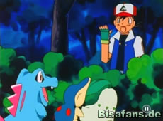 Als Team Rocket sich mit dem Sauger Pikachu schnappt, schickt Ash Endivie und Bisasam in den Kampf. Team Rocket setzt Sarzenia und Arbok ein. Mit Feurigels Flammenwurf kann Pikachu jedoch gerettet werden. Dieser macht anschließend kurzen Prozeß mit Team Rocket, die wieder per Donnerblitz weggeschleudert werden. Ash freut sich unterdessen über die Menge an Äpfeln, die Jessie und James eingesammelt hatten!