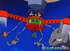 Mit Hilfe einer Puppe und einem Mikrofon locken Jessie und James Karnimani, Endivie, Feurigel und Bisasam in eine Falle und laufen weg. Ash und Misty verfolgen sie, landen jedoch in einer Fallgrube und Team Rocket schnappt sich alle restlichen Pokémon von Ash und Misty. Zum Glück weckte Golbat Rocko auf, so daß er nun einschreiten kann. Mit einem Angriff kann Golbat den Ballon zum Platzen und Abstürzen bringen, was auch alle Pokémon befreit. Mit Hilfe von Tannza und Golbat geht es dann in den Kampf gegen Smogmog und Arbok. Onix' Steinwurf und Pikachus Donnerblitz geben Team Rocket schließlich den Rest!