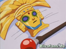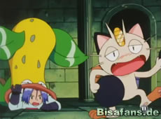 Team Rocket findet auch einen Raum und darin eine Statue mit einer Maske und einem Stab. Als Jessie die Maske aufsetzt, wirkt sie nicht nur verändert, sie kann Sarzenia und Mauzi auch Befehle erteilen. In diesem Moment treffen unsere Freunde ein und sehe Jessie mit der Maske, die gerade ihren Team Rocket Spruch aufsagt.