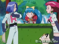 Beim Essen kommen jedoch auch unsere Freunde in den Raum und Misty erkennt die beiden sofort. Rocko bekommt jetzt erneut eine Krise, als er merkt, daß James seine Freundin bekommen soll. Enttarnt macht sich Team Rocket auf die Flucht mit den geklauten Pokebällen. Die naive Tevoltra versteht das alles nicht und hält es für ein Mißverständnis.