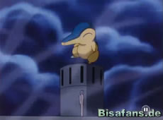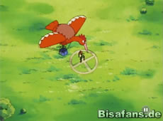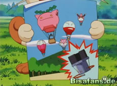 Mit viel Mühe klappt das dann auch und alle überwinden den Sturm. Doch Team Rocket schummelt erneut und beschießt den Pikachu-Ballon mit Raketen. Als Feurigel runterzufallen droht kann Ash ihn noch retten – verletzt sich dabei aber an der Schulter. Um weitere Schummeleien zu unterbinden schickt Ash Pikachu auf Noctuh los um Team Rocket zu bekämpfen.