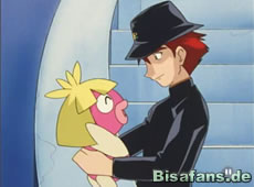 Glücklicherweise ist Brad aber in Hör-Reichweite und erhält nun doch von Ash sein Kussilla zurück. Aber auch Jessie, die sich in Kussilla verliebte will es haben, so daß Team Rocket auch etwas im Schilde führt. Das Glück ist heute auf Team Rockets Seite. Beim Verkleiden als Sicherheitskräfte erhalten sie vom Manager den Befehl unsere Freunde und das Kussilla aus dem Gebäude zu entfernen. Brad ist inzwischen schon auf dem Weg zu Show und vertraute sein Kussilla unseren Freunden an.