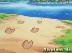 Die Verfolgung der Spuren führt unsere Freunde bis an den Rand des Sees. Doch Misty und Ash finden einen Apfelstümmel, der sie auf die Idee bringt einen Apfelbaum zu suchen, da das Rizeros sich dort wahrscheinlich immer seine geliebten Äpfel holt.