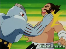 Als der Mann vom Maschock per Überroller weggeschleudert wird, eilt Ash ihm zu Hilfe, doch der Mann hat keine wirklichen Schmerzen. Er freut sich vielmehr über die perfekte Ausführung des Überrollers von seinem Maschock. Als sich herausstellt, daß Ash zur hiesigen Arena will, geht es im Dauermarsch zur Arena. Dabei wirkt der Mann irgendwie nicht so gut trainiert, da er kaum schneller als Ash, Misty und Rocko ist... Bei der Arena angekommen bekommt Ash von dem Mann, der sich nun als Hartwig vorstellt erst einmal ein ordentliches Essen.