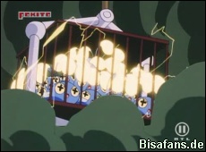 Im dichten Nebel können Pikachus Attacken den Ballon nicht treffen, doch als die Lampis anfangen zu leuchten und Ash Karnimani, Pikachu und Lorblatt zusammen einsetzt erhofft er sich einen Sieg über Team Rocket. Leider aber ein Fehlschlag. Doch als die gefangenen Lampis alle eine Donnerwelle einsetzen, können sie entkommen und Pikachu verpaßt Team Rocket die gewohnte Abschluß-Attacke.